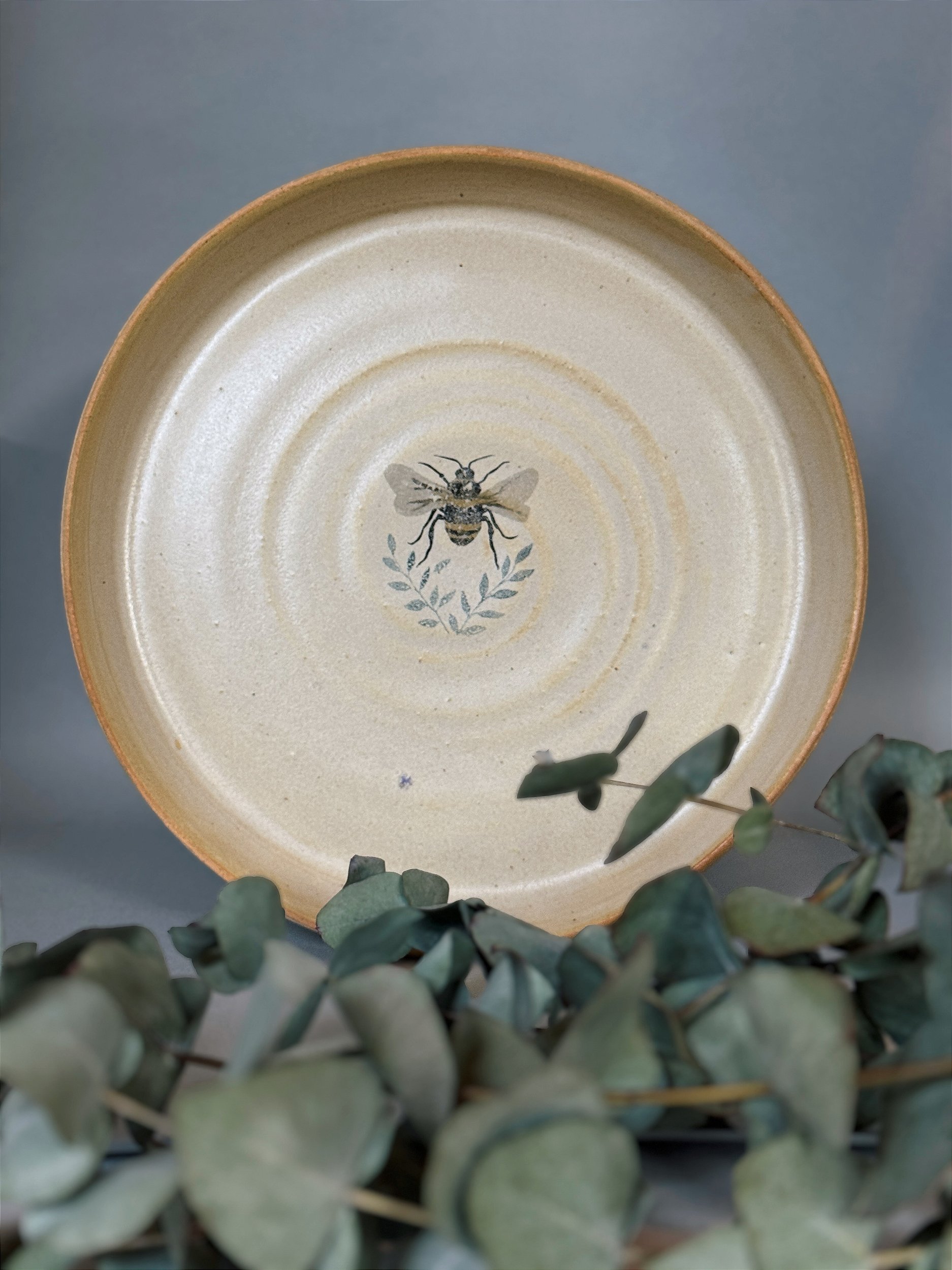 Bandeja redonda Apis feita em cerâmica e estampada com a logo Apis aquarela da. Trata-se de uma peça cheia de delicadeza que foi desenvolvida especialmente para comemoração de 8 anos do ateliê . A pintura leve no estilo aquarela confere á peça uma beleza suave. As abelhas entre flores no jardim representam um convite para viver o que importa. para agradecer a presença e para celebrar tudo o que fica.