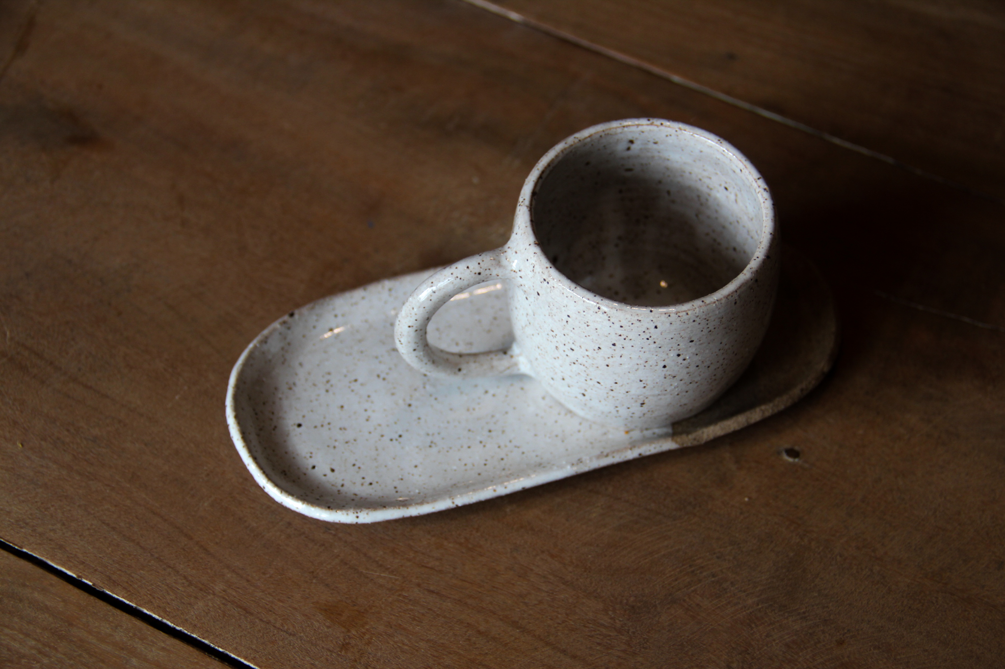Peça feita em cerâmica .Caneca para café con alça super confortavel. Seu formato permite reter calor por mais tempo. O prato que faz parte do conjunto tem um design comprido que comporta muito bem a caneca e acompanhamentos como biscoitos e castanhas. Peça produzida no torno com argila tabaco.