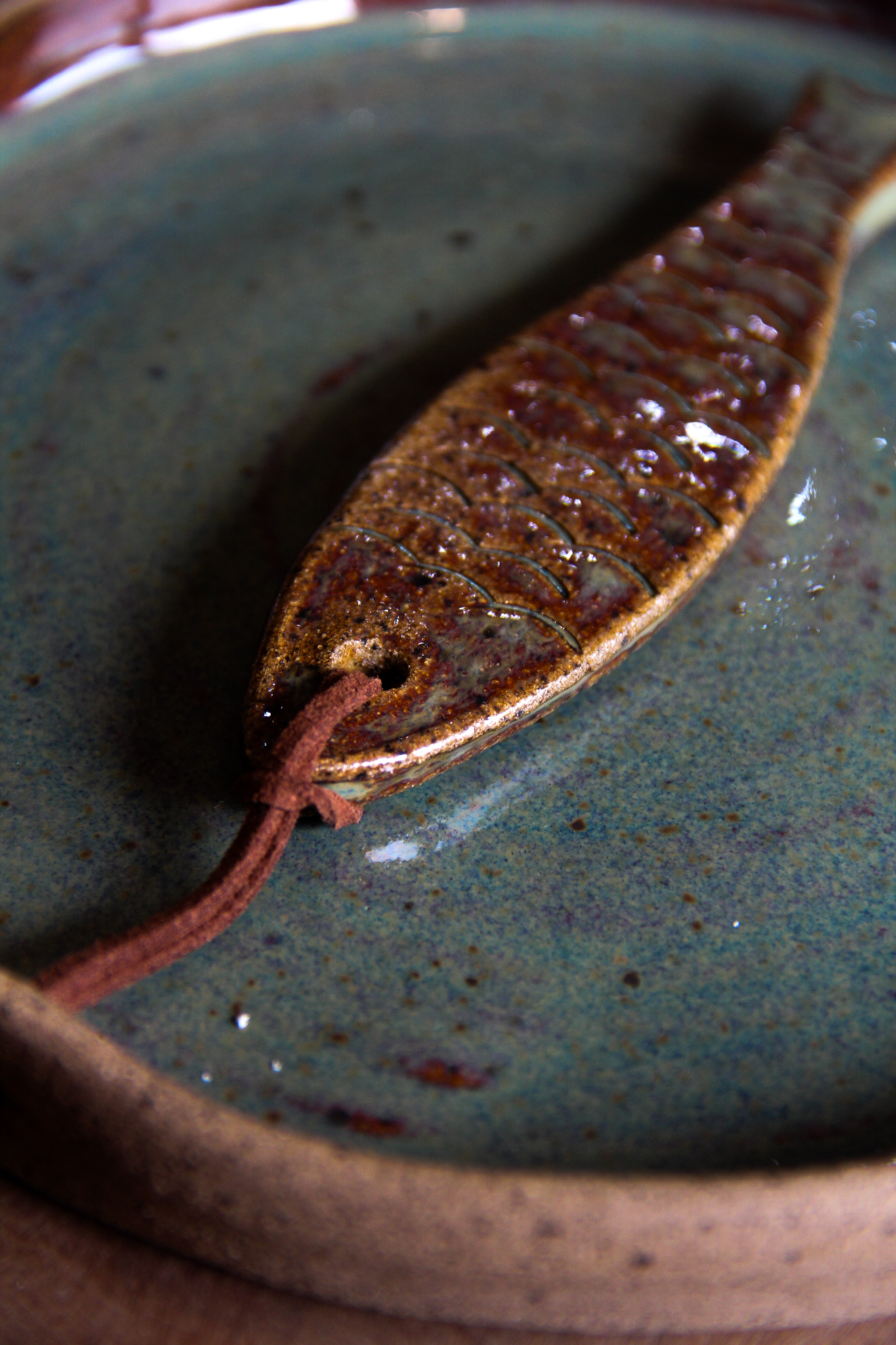 Peça feita em cerâmica com borda baixa e peso em forma de sardinha.Otimo para usar tanto em ambientes internos quanto em areas externas.Peça produzida no torno com argila tabaco.